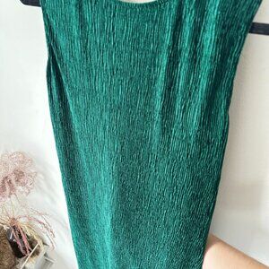 Emerald green midi-length sleeveless Adrienne dress from Maeve by Anthropologie; the fabric has an almost metallic shimmer