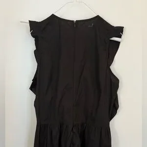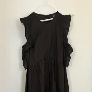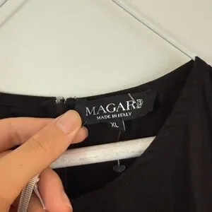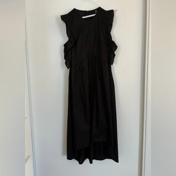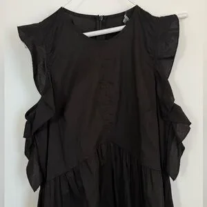 Chic black dress with ruffle sleeves. Perfect for any occasion. Magari brand, made in Italy, size XL.