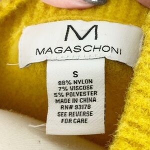 Brighten your wardrobe with this bold Magaschoni mustard yellow sweater, designed in a textured knit for cozy warmth with a modern edge. Crafted from a soft nylon-viscose blend with a touch of polyester, it offers both comfort and structure. Featuring a crew neckline, long sleeves, and ribbed cuffs/hem, this piece is easy to style and perfect for layering.
