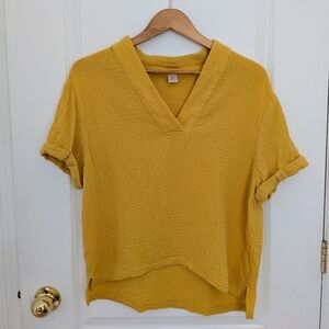 Magaschoni Mustard Yellow V-Neck Top – Rolled Sleeve Blouse, Women’s Medium #108