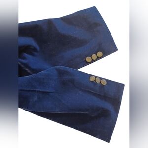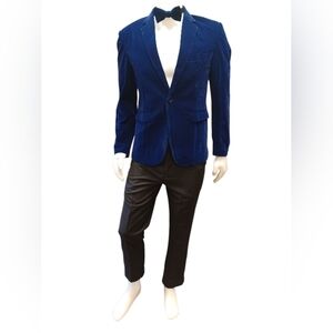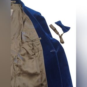 Velvet suit coat with matching clip on bow tie and black trousers, a rich blue velvety double breasted blazer featuring inside and out side pockets with a blue velvet matching, bow tie. Matching black trousers featuring a zipper, button and clasp closure. Trend and formal.