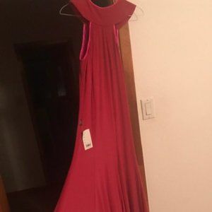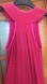 Magenta new dress size L but fits M too ( strechy ). Round high neck and flare bottom. Very strechy . Has few small buttons in the back at neck area.new without tag