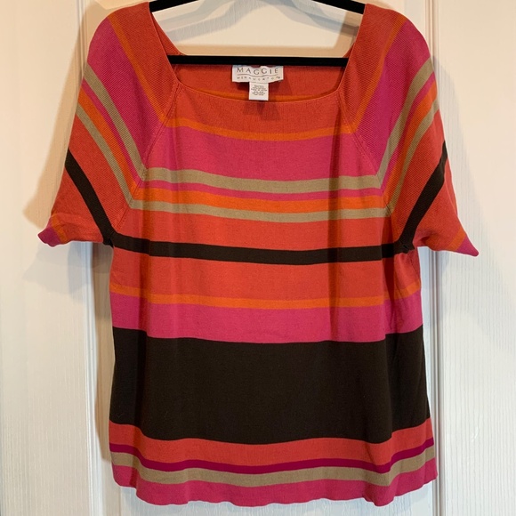 Comfortable and flattering short-sleeve top from Maggie McNaughton featuring bold horizontal stripes in pink, orange, and brown tones. Designed with a relaxed fit and a soft feel, this piece is perfect for everyday wear while still offering a polished, colorful look.