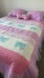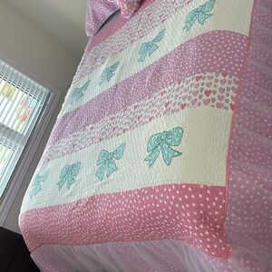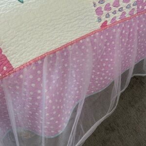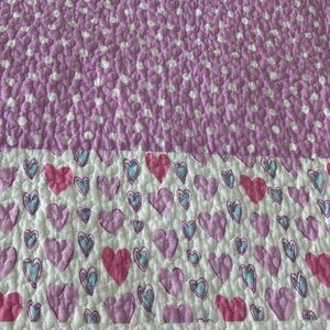 Quilt top has bows, hearts and polka dots in pink/light purple, white and blue. The reverse is all blue and white polka dots. Double layer Sheer overlay at ends of quilt.