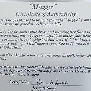 Maggie is 19 inches tall and comes with a display stand-she is hand made and hand painted-mint condition-has been stored in the box-also included are a bunny, a handbag, and certificate of authenticity-smoke free home