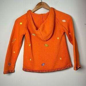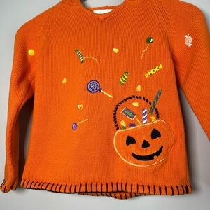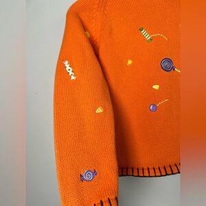 Maggie & Zoe sweater with a hood. Knit style with long sleeves. Halloween trick-or-treat theme with a mixture of embroidery and stitching to create beautiful candy and pumpkin embellishments throughout the front, back and sleeves. Perfect for all of your fall activities! Comfortable, more of a heavy weight and not itchy! Research shows tag is a vintage style - but I can't be certain!