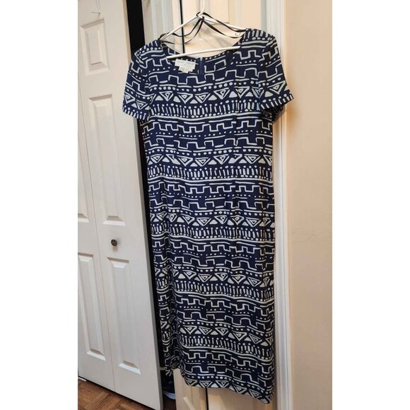 Maggy London long SILK navy-and-white Aztec or Greek patterned special occasion dress, size 14. Lined, short sleeves, back zipper. Midi or maxi length, depending on your height.
