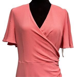 Short sleeve, ruched side, wrapped, midi length, back concealed zipper