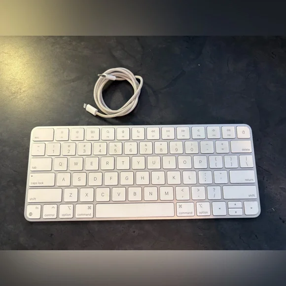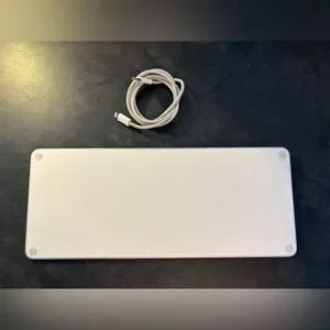 Sleek white wireless keyboard. Includes matching charging cable.