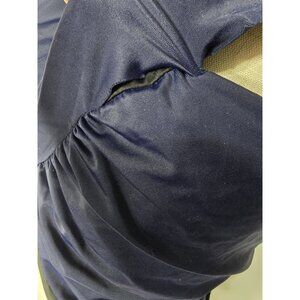 While new with original tags, please note the following visible imperfections: The tags exhibit some wear, and the liner remains attached. There is a stitching flaw on the side, where the stitching is unraveling. Additionally, near the pullover strap, the blue fabric has detached from the swimsuit, creating a gap. This flaw can be readily mended with a needle and thread, or it may be left as is, as its visibility is dependent on how the swimsuit is worn. There is some minor snags on the back fabric.