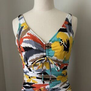 Yasmin one piece swimsuit by Magicsuit. Multicolour abstract floral pattern with a v neck front, tie between bust that can be tightened or loosened to customize coverage, ruched mid section and scoop neck back with good bum coverage. Fully lined, slimming and flattering!