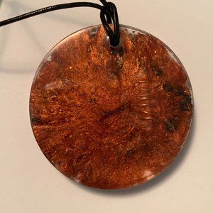 This beautiful hand made circular pendant is infused with copper color and magnetic hematite stones.