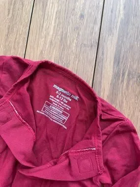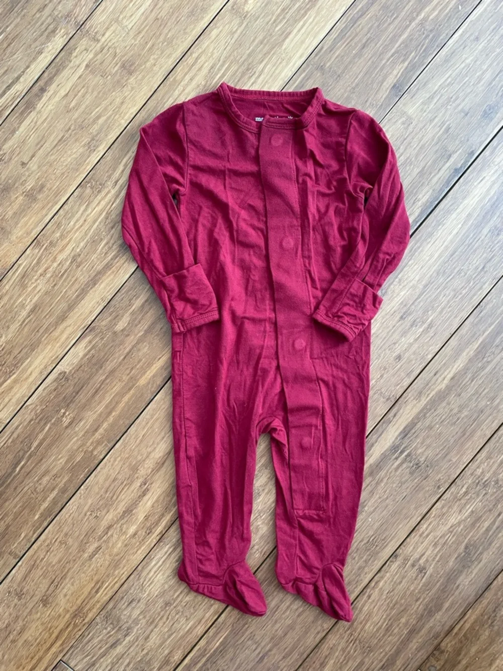 Magnetic Me long-sleeve footed one-piece in a deep berry red. Snap-front closure for easy changes. Soft, stretchy knit for comfort. Suitable for sleep and play. Machine washable care.