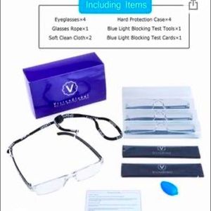 Set of four, brand new, never used, magnifying reading glasses with blue light protection. For everyone, arms are clear, black, brown and purple.