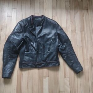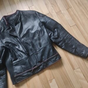 Sleek black leather jacket by Magnum. Features zippered pockets and ribbed detailing.