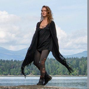 A dramatic cardigan with long fringes on both front panels. Deep pockets make this amazing piece wildly practical! Fabric is incredibly soft and has a good amount of stretch, making the sizes very flexible.