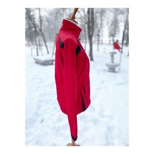 Size 38/44 on tag. 100% polyester. Made in Portugal. Hook and loop fasteners on cuffs have been removed so cuffs are no longer able to be tightened from relaxed position. No tears. One discoloured mark on right cuff sleeve. No other stains noted. Some areas of surface fabric slightly rippled, this may be natural for the fabric or wear. Pet and smoke free home.