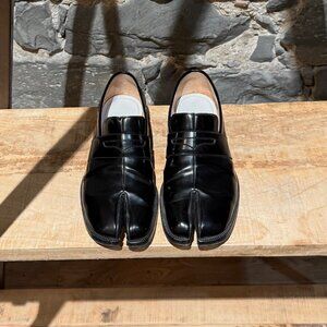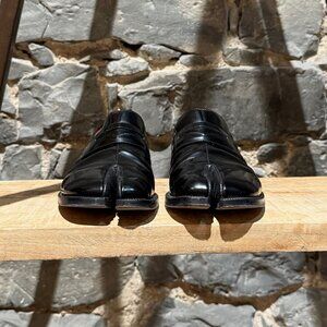Glossy patent black calf leather with a traditional penny strap. Signature split-toe Tabi construction. and single white stitch detail at the back. Leather insoles and outsoles. Made in Italy. Come with box and dustbag.