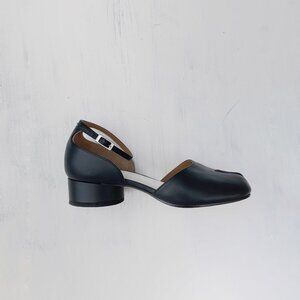 Maison Margiela Tabi sandals in black leather with ankle closure & low round heel. D'orsay style with signature tabi toe box and ankle section with strap. Made in Italy. Originally $1,565