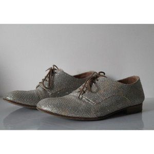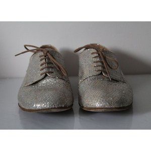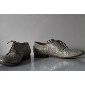Lace up, basket-weave oxford with crosshatch stitching & glitter coating throughout.