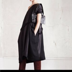 Shell matte: 76% wool 20% Polymide 4% elastane / Shell shiny: 100% cupro / Lining: 100% viscose. Black color. 2 different materials (one satin-y and one like wool). Fully lined. Belt (with no toggle) around waist; permanent belt loops. Fully lined. Very short sleeves. Full zip down back with hook and eye. Oversized style, but with the belt you can give yourself more of a waist than in the stock photos.