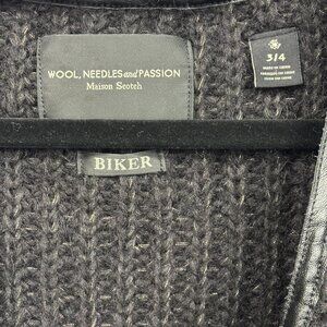 A stunning Maison Scotch cardigan crafted with wool, needles, and passion—a perfect blend of edgy and elegant. This biker-style cardigan features gold fleck detailing throughout and sleek leather trim, making it a standout layering piece.