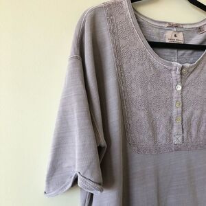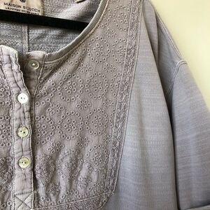 This sweater dress is a beautiful purple lilac colour with a embroidered lace bib and pearl iridescent buttons. A fall cozy, causal staple.