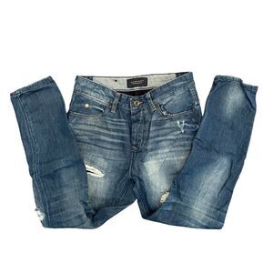 Maison Scotch L'Adorable Distressed Destroyed Sky Boyfriend Jeans Indigo Women's 25. The jeans have "faux" rips - there is denim in behind them. Can be worn rolled up. Relaxed fit with rips and abrasions to the thighs. Very good used condition. Please see photos for approximate measurements.