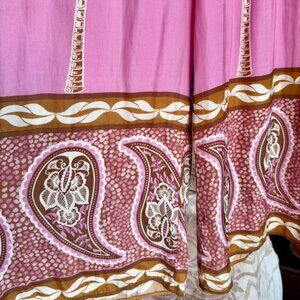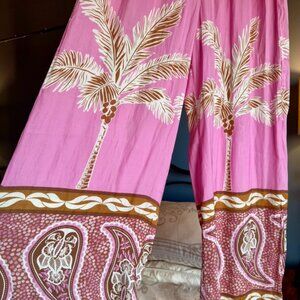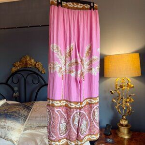 Pink with tan palm and paisley print wide leg silky fabric pants by Maison d'Amelie Paris, size S. Drawstring elastic waist, great used condition. Waist measures about 14.25 inches laying flat, can stretch of course due to elastic. Inseam is 28 inches. Cat friendly, nonsmoking home.