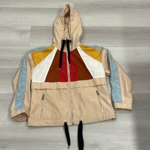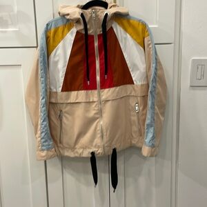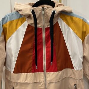 Maje Banela color block windbreaker/raincoat jacket in beige with color blocking on the chest and sleeves, shell hood with drawstring, zip closure, drawstring hem, two front zip pockets. 100% polyester.Size 36/ US Small. Excellent pre owned condition. Please see photos, measurements are for reference only. Reasonable offers welcome!