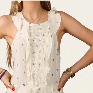 Effortlessly chic and feminine, this Maje dress features a light cream base with delicate allover ladybug print. Designed with ruffled trim, a pintucked front, and a tiered skirt, it gives off a playful yet polished vibe. The sleeveless silhouette makes it perfect for warm days, while the flowy fit keeps it comfortable and flattering. Pair it with sandals for a casual daytime look or dress it up with heels for an easy, elevated outfit.