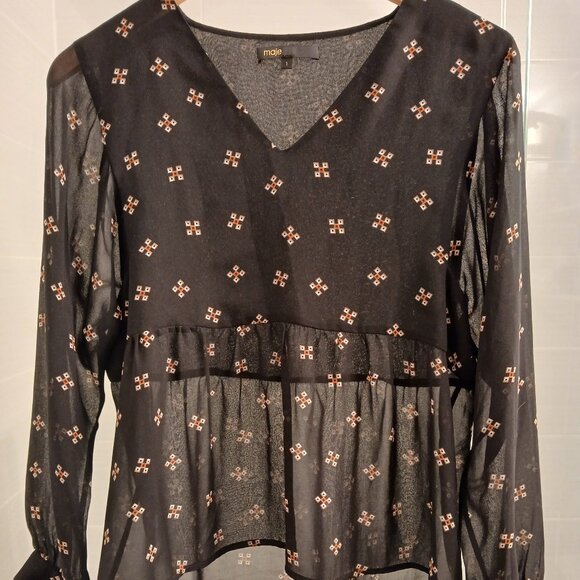Maje Leona geometric-print chiffon top. Size 1 32cm shoulder to shoulder 45cm pit to pit 60cm length Maje chiffon top Slips on V-neck, long sheer sleeves, buttoned cuffs, all-over geometric print, peplum 100% polyester