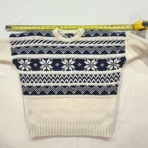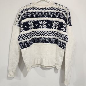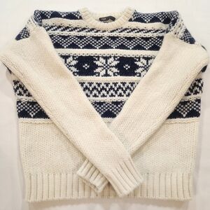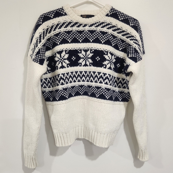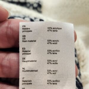 In good condition. White and black sweater. Thick and fuzzy, some pilling from gentle wear.