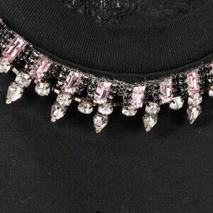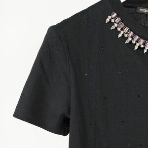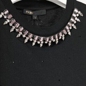 This t-shirt from Maje is crafted in a Noir black cotton jersey, and features short sleeves, a round ribbed neckline with diamanté embellishments, a tonal embroidered logo on the back, and tonal diamanté on the front bodice.