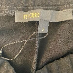 Maje Parmane high-rise, black and green, side-striped, wide-leg, crepe trousers. Slip on. Comfortable, flowy material. Green satin stripe down each leg. Elasticized waistband. Two pockets. Main Fabric: 78% acetate, 22% viscose. Band: 100% viscose. Excellent pre-loved condition. A cool, effortless style. Pair with a basic tee and sneakers or chunky loafers this season!