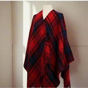 Maje Poncho Plaid Wool blend Wrap Womens Large Red Fringed One Size CoverUp Fall