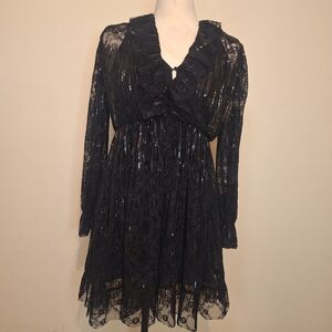 Short, flowing dress, slightly cinched at the waist. Black pleated lace with floral motif embroidered with sequins. Long, loose sleeves, elasticated at the hems with ruffle finish. Removable stretch viscose underlayer with adjustable straps. V neckline with ruffle finish. Elasticated under the bust. Perfect for evening.