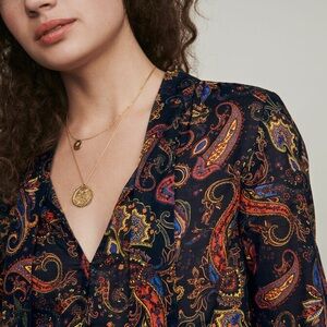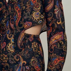 All-over paisley print on a navy base. 100% Cotton voile so the dress is incredibly light AND SHEER. Long sleeve with button cuffs. V-neck with buttons. bow tie at neck. Elasticized waist with 2 cutouts. Asymmetric skirt.