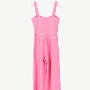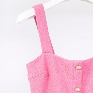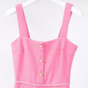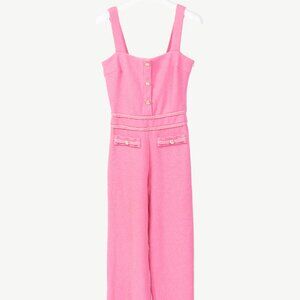 Made in Bulgaria, this pant suit from Maje is crafted in a Rose pink cotton-blend tweed, and is accented with tonal braided trim. It features wide shoulder straps, a square neckline, decorative front buttons, a fitted waist, faux front pockets, wide-cut legs, frayed hems, an invisible side zip closure, and is partially lined in a tonal cotton.