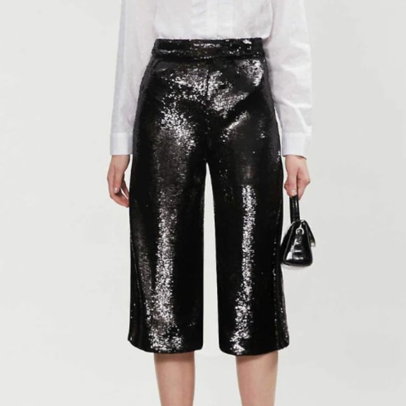 Size: 34 in Maje sizing, Equivalent to a US X-Small. Color: Black. Shell: 97% polyester; 3% elastane. Lining: 95% polyester; 5% elastane. Side zipper closure. Partially lined. High rise. Wide-leg. Cropped. Structured waistband. All over sequin embellishment. Darts at back.