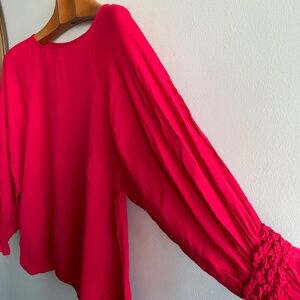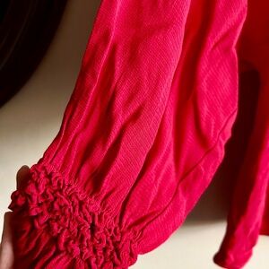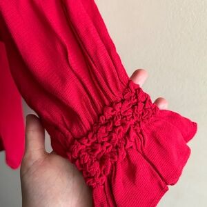 Gorgeous vibrant red blouse from French brand Maje. Features lightweight textured fabric with statement balloon sleeves and smocked elastic cuffs with a delicate ruffle detail. Relaxed, easy fit with a feminine silhouette — perfect for dressing up or down.