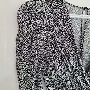 Slips on. V-neck, long sleeves, leg-of-mutton sleeves, all-over animal print, fitted waist, straight leg.
