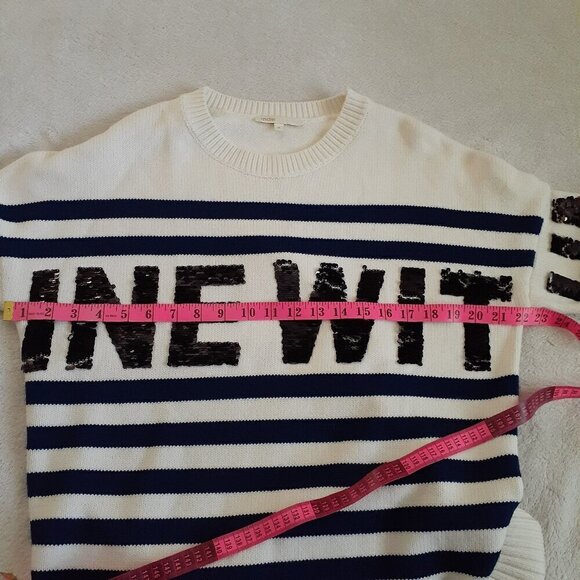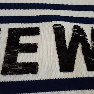 Color: Ecru (off-white/cream) with navy blue stripes and black sequins