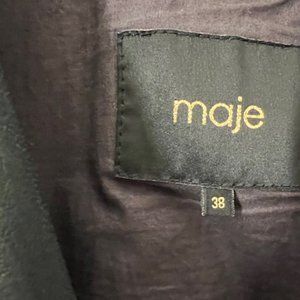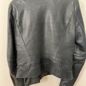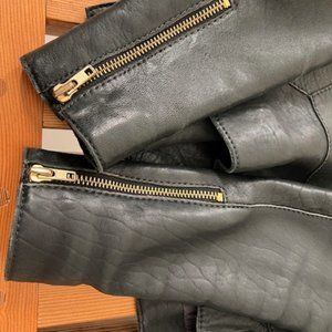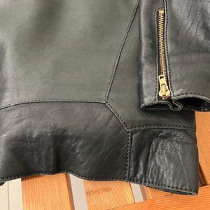 This tailored Maje motorcycle jacket was purchased from Galeries Lafayette in Paris. The black lamb leather is soft and supple, the lining is cotton, and the jacket features an array of smoothly working zippers: an asymmetrical front zipper, three zippered pockets, and zippers at the cuffs of the sleeves. Unlike many stiff leather jackets, this one is soft and easy-to-wear, zipped up or open at the front. Fits like a US size 8-10.