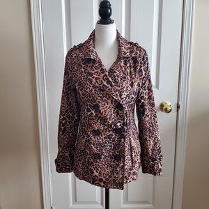 Lightweight and stylish animal print double breasted short trench coat, front pockets and belt loops (belt not included, shown as a styling suggestion).