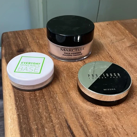 1) Marcelle Face Powder. Hypoallergenic. This ultra/light loose powder evens skin tone and allow makeup to last longer. It’s mattifying formula absorbs excess sebum and leaves skin looking natural.