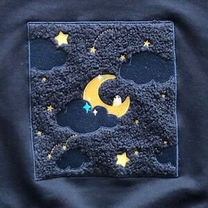 Counting sheep in Goodnight Blue ⭐️ Featuring Mako on the moon in a cosmic motif sprinkled with stars on a fluffy bed of clouds and adorable "sleepy" embroidery on the back. 😴⭐️🌙
