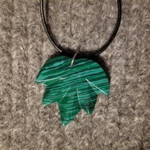 Malachite gemstone maple leaf pendant necklace jewelry/jewellery, ~1.75 inch long carved stone, NWOT, on a leather black cord, unisex, created malachite.