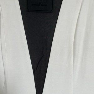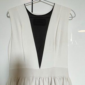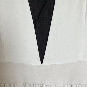 Such a cute dress for a summer cocktail party! This dress hangs really well and gives a nice swing in the skirt. 62% poly, 33% viscose, 5% elastane. Fully lined. The plunge 'v' on the front is a sheer black fabric.