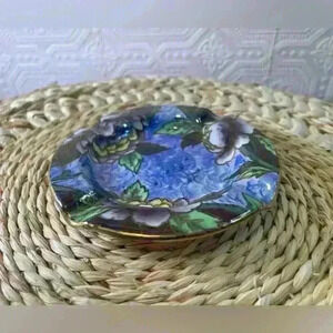 Beautiful and rich colors it has with a dark cobalt blue back around bright green in that pink and yellow floral. Measurements are 5 inches in diameter no chips no cracks.